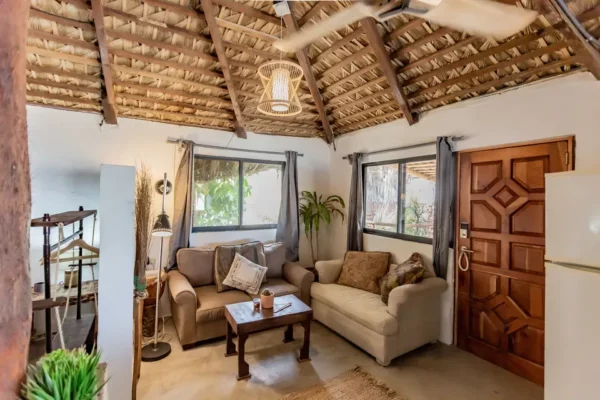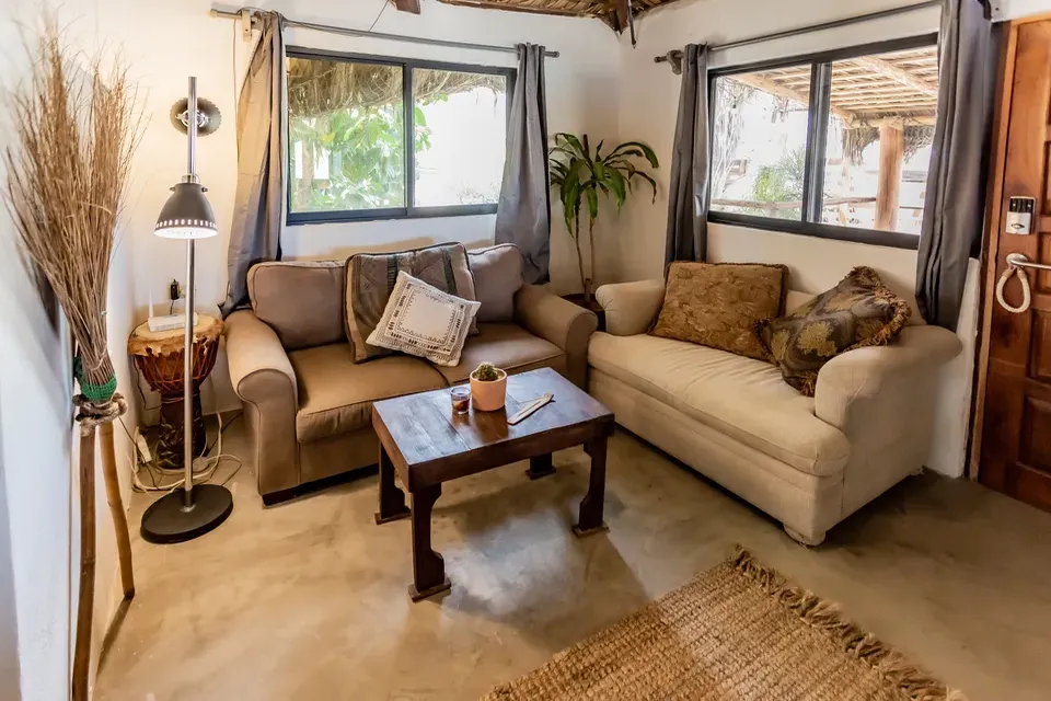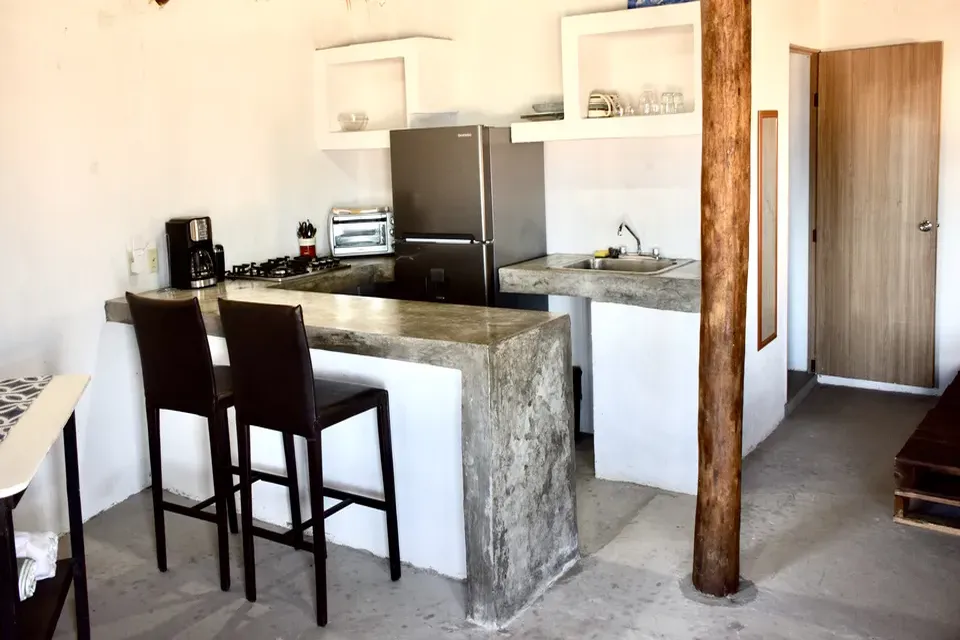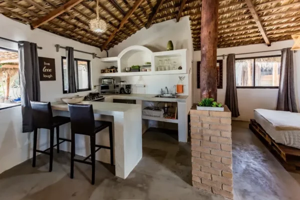Our cabins are perfect for stays of several days. All furniture is recycled or handmade by us with clean, minimalist and quality designs inspired by nature. Experience a green cabin without compromising quality or comfort. Make nature your home. Each cabin has a fully equipped kitchen and private bathroom.