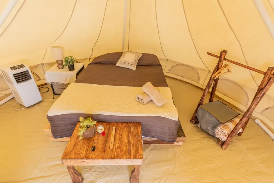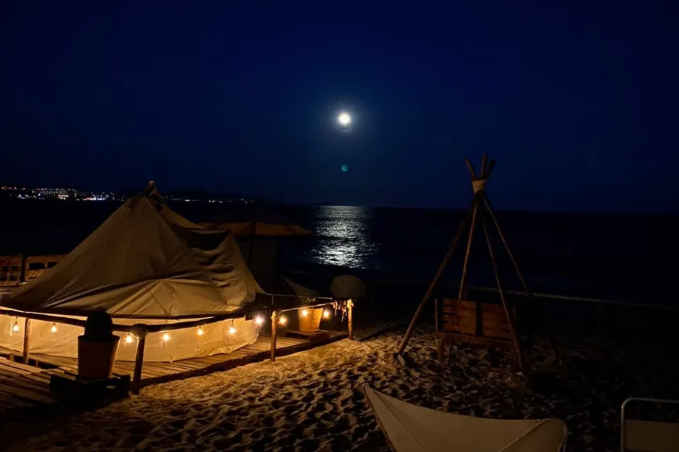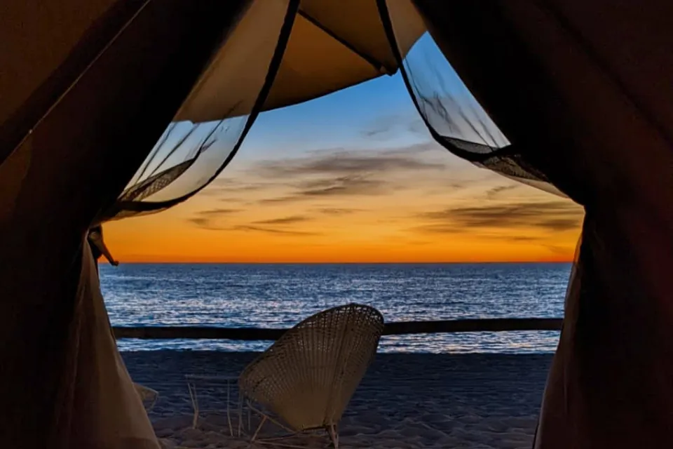 Each tent is built on a wooden deck to ensure a level, dry floor and give you a warm, natural feel. Inside, the tent has everything you need, including air conditioning, a comfortable bed, electricity, a safe, a nightstand, and a light. You will sleep listening to the sound of the sea and you will wake up seeing the sun rise in front of your bed.